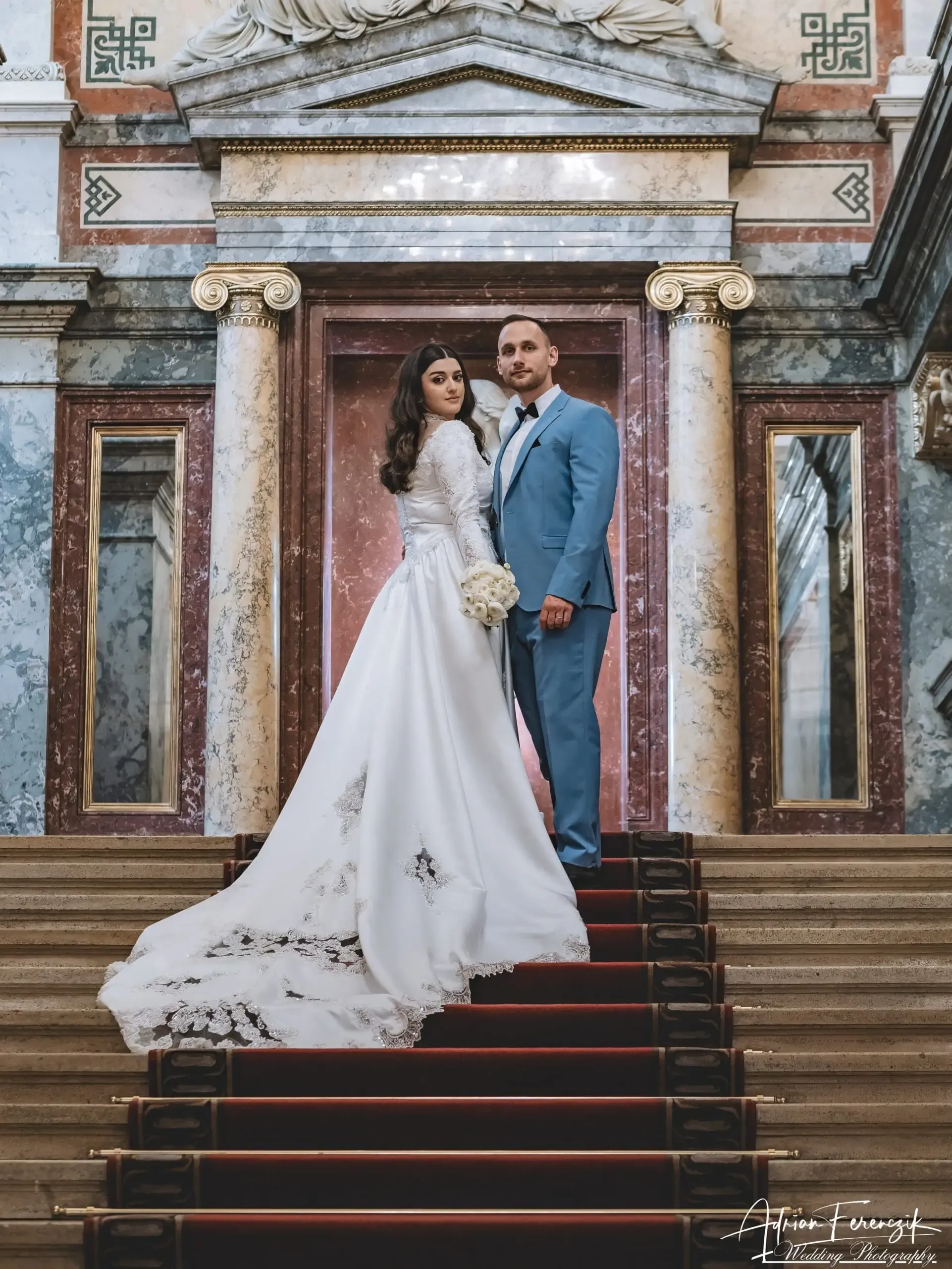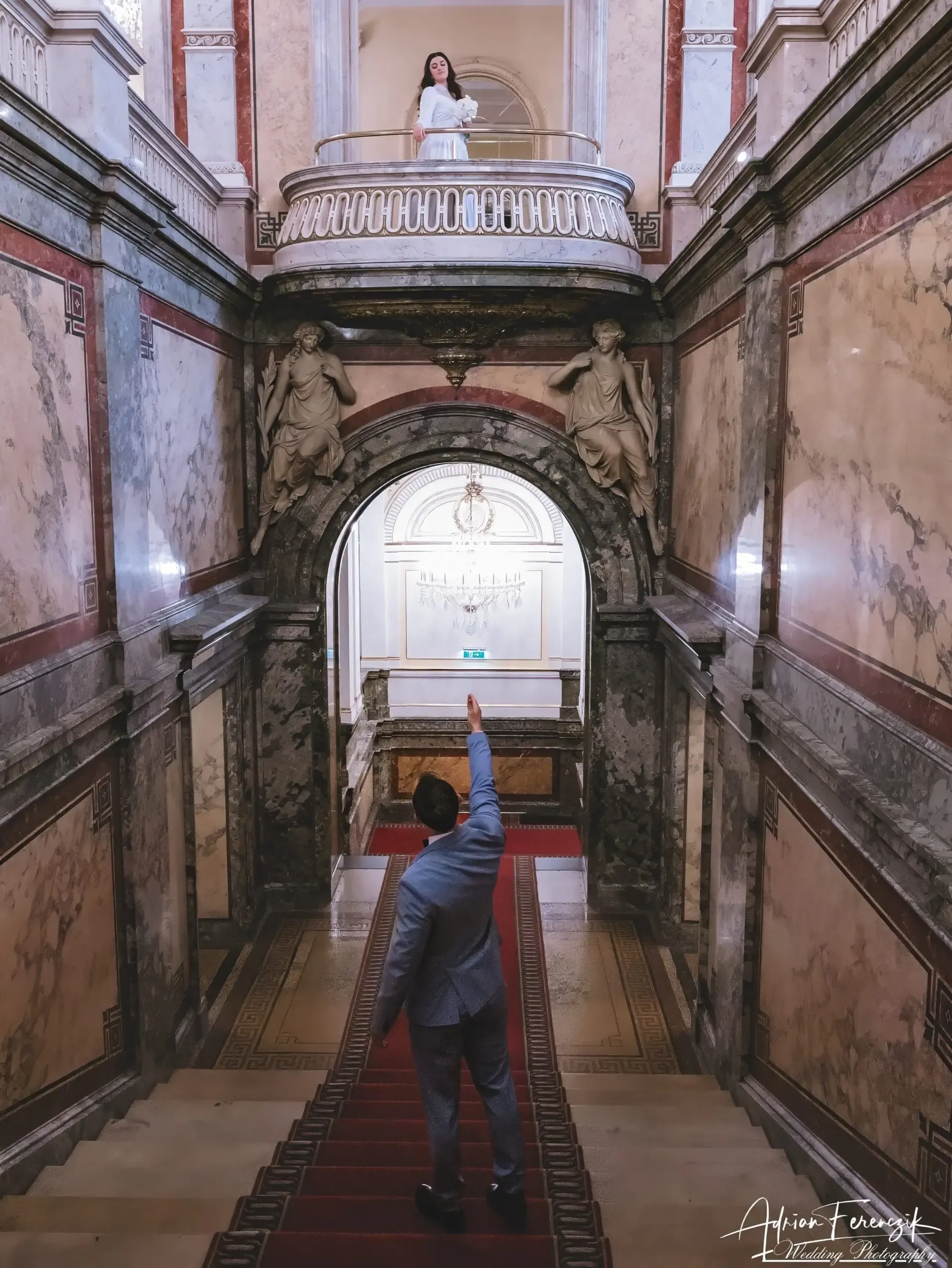 Nach den Vorbereitungen verließ die Braut das Haus und wurde von einer wartenden Pferdekutsche überrascht, die sie direkt zum prachtvollen Hotel Imperial brachte. Diese Fahrt durch die historischen Straßen Wiens bot perfekte Szenen für romantische Fotos. Das Hotel Imperial, bekannt für seine exquisite Architektur und königliche Geschichte, erwies sich als der ideale Ort für diese elegante Hochzeit.